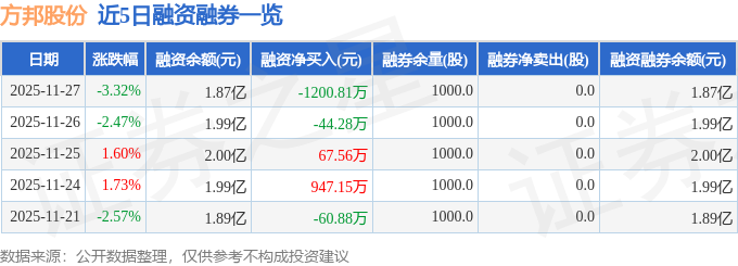 方邦股份融资融券信息显示,融资方面,当日融资买入852.93万元,融资偿还2053.74万元,融资净偿还1200.81万元。融券方面,融券卖出0.0股,融券偿还0.0股,融券余量1000.0股,融券余额5.8万元。融资融券余额1.87亿元。