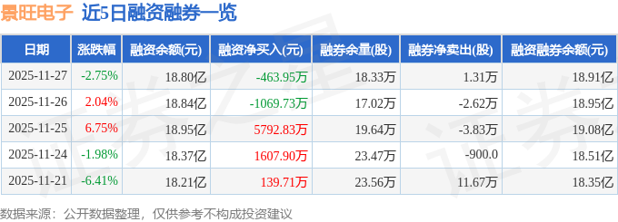 景旺电子融资融券信息显示,融资方面,当日融资买入1.51亿元,融资偿还1.56亿元,融资净偿还463.95万元。融券方面,融券卖出2.58万股,融券偿还1.27万股,融券余量18.33万股,融券余额1161.39万元。融资融券余额18.91亿元。