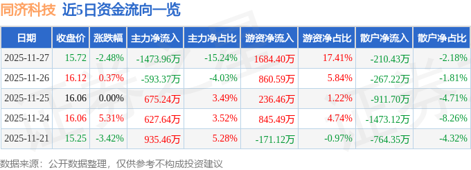 证券之星消息,截至2025年11月27日收盘,同济科技(600846)报收于15.72元,下跌2.48%,换手率0.98%,成交量6.1万手,成交额9673.01万元。