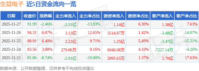 11月27日的资金流向数据方面,主力资金净流出2.51亿元,占总成交额13.93%,游资资金净流入1.14亿元,占总成交额6.3%,散户资金净流入1.38亿元,占总成交额7.63%。