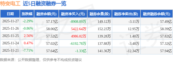 特变电工融资融券信息显示,融资方面,当日融资买入6.68亿元,融资偿还7.57亿元,融资净偿还8908.09万元。融券方面,融券卖出4.84万股,融券偿还7.95万股,融券余量149.12万股,融券余额3188.12万元。融资融券余额57.49亿元。