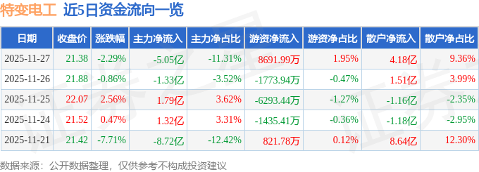 证券之星消息,截至2025年11月27日收盘,特变电工(600089)报收于21.38元,下跌2.29%,换手率4.03%,成交量203.78万手,成交额44.61亿元。