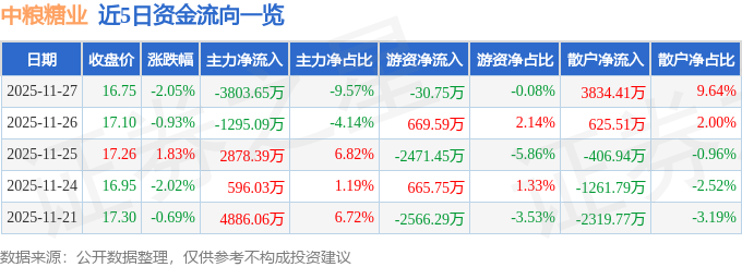 证券之星消息,截至2025年11月27日收盘,中粮糖业(600737)报收于16.75元,下跌2.05%,换手率1.1%,成交量23.45万手,成交额3.98亿元。