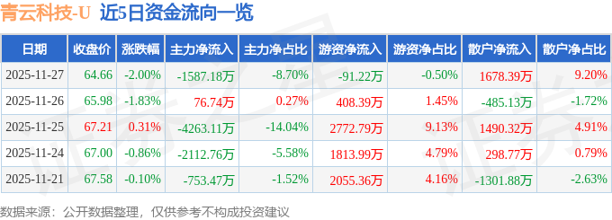 证券之星消息,截至2025年11月27日收盘,青云科技(688316)报收于64.66元,下跌2.0%,换手率5.86%,成交量2.81万手,成交额1.82亿元。