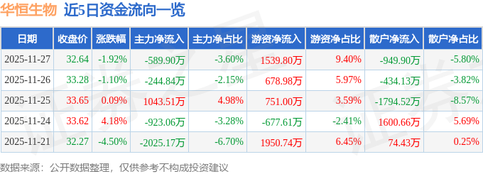 证券之星消息,截至2025年11月27日收盘,华恒生物(688639)报收于32.64元,下跌1.92%,换手率1.99%,成交量4.97万手,成交额1.64亿元。