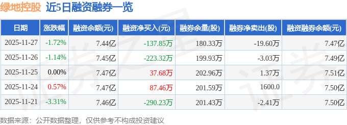 绿地控股融资融券信息显示,融资方面,当日融资买入1387.03万元,融资偿还1524.88万元,融资净偿还137.85万元。融券方面,融券卖出1.22万股,融券偿还20.82万股,融券余量180.33万股,融券余额308.36万元。融资融券余额7.47亿元。