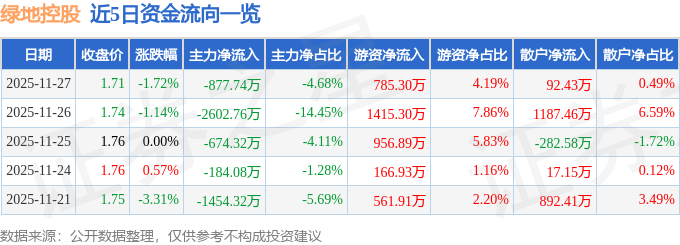 证券之星消息,截至2025年11月27日收盘,绿地控股(600606)报收于1.71元,下跌1.72%,换手率0.78%,成交量109.87万手,成交额1.87亿元。