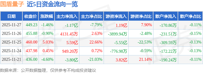 证券之星消息,截至2025年11月27日收盘,国盾量子(688027)报收于449.23元,下跌1.46%,换手率4.09%,成交量3.29万手,成交额15.01亿元。