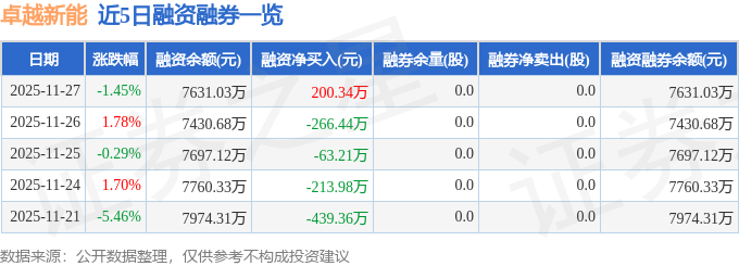 卓越新能融资融券信息显示,融资方面,当日融资买入561.7万元,融资偿还361.35万元,融资净买入200.34万元。融券方面,融券卖出0.0股,融券偿还0.0股,融券余量0.0股,融券余额0.0万元。融资融券余额7631.03万元。