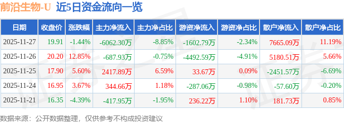 证券之星消息,截至2025年11月27日收盘,前沿生物(688221)报收于19.91元,下跌1.44%,换手率9.07%,成交量33.96万手,成交额6.85亿元。