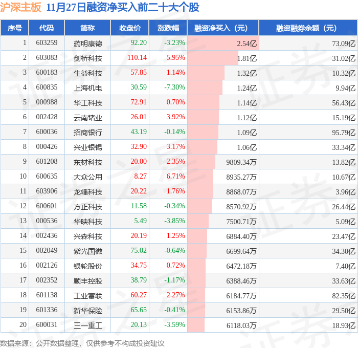 沪深主板融资净买入前三分别为:药明康德(603259)融资净买入2.54亿元、剑桥科技(603083)融资净买入1.81亿元、生益科技(600183)融资净买入1.32亿元,前20具体见下表: