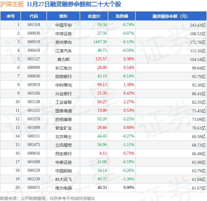 沪深主板融资融券余额前三分别为:中国平安(601318)融资融券余额243.43亿元、中信证券(600030)融资融券余额188.52亿元、贵州茅台(600519)融资融券余额172.76亿元,前20具体见下表: