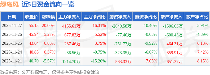 证券之星消息,截至2025年11月27日收盘,绿岛风(301043)报收于55.13元,上涨20.0%,涨停,换手率8.65%,成交量4.91万手,成交额2.55亿元。