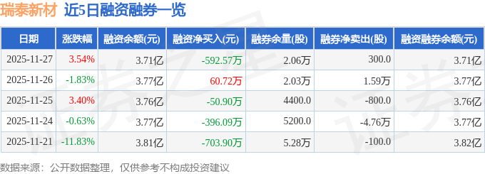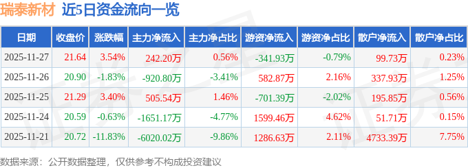 证券之星消息,截至2025年11月27日收盘,瑞泰新材(301238)报收于21.64元,上涨3.54%,换手率2.71%,成交量19.89万手,成交额4.31亿元。