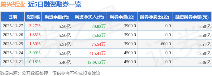 证券之星消息,截至2025年11月27日收盘,景兴纸业(002067)报收于5.69元,上涨3.27%,换手率11.08%,成交量148.25万手,成交额8.38亿元。