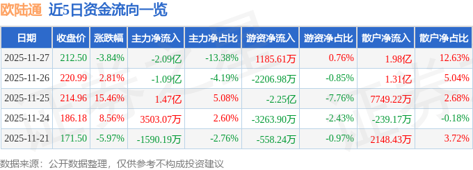 证券之星消息,截至2025年11月27日收盘,欧陆通(300870)报收于212.5元,下跌3.84%,换手率6.57%,成交量7.21万手,成交额15.64亿元。