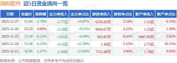 证券之星消息,截至2025年11月27日收盘,润和软件(300339)报收于51.84元,下跌2.79%,换手率4.31%,成交量33.5万手,成交额17.56亿元。