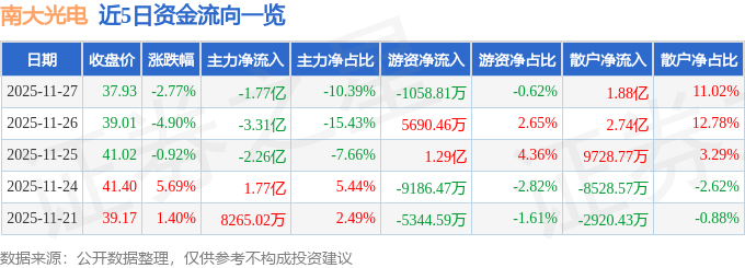证券之星消息,截至2025年11月27日收盘,南大光电(300346)报收于37.93元,下跌2.77%,换手率6.67%,成交量43.78万手,成交额17.03亿元。