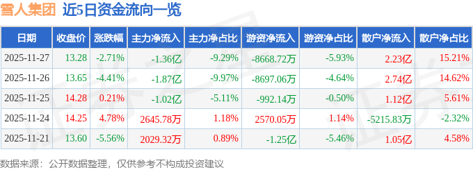 证券之星消息,截至2025年11月27日收盘,雪人集团(002639)报收于13.28元,下跌2.71%,换手率16.75%,成交量108.98万手,成交额14.63亿元。
