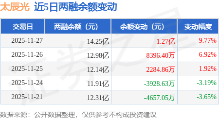 证券之星消息,11月27日,太辰光(300570)融资买入6.0亿元,融资偿还4.73亿元,融资净买入1.27亿元,融资余额14.21亿元,当日融资净买入排名第16,近3个交易日已连续净买入累计2.31亿元,近20个交易日中有11个交易日出现融资净买入。