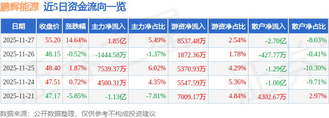 证券之星消息,截至2025年11月27日收盘,鹏辉能源(300438)报收于55.2元,上涨14.64%,换手率15.48%,成交量62.58万手,成交额33.62亿元。