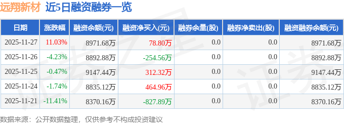 远翔新材融资融券信息显示,融资方面,当日融资买入3802.22万元,融资偿还3723.42万元,融资净买入78.8万元。融券方面,融券卖出0.0股,融券偿还0.0股,融券余量0.0股,融券余额0.0万元。融资融券余额8971.68万元。