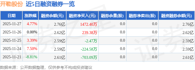 开勒股份融资融券信息显示,融资方面,当日融资买入4988.83万元,融资偿还3516.43万元,融资净买入1472.4万元。融券方面,融券卖出0.0股,融券偿还0.0股,融券余量0.0股,融券余额0.0万元。融资融券余额2.76亿元。