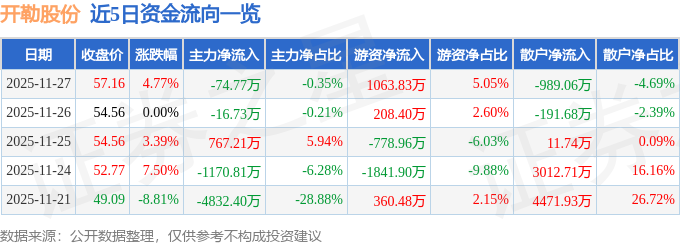 证券之星消息,截至2025年11月27日收盘,开勒股份(301070)报收于57.16元,上涨4.77%,换手率6.24%,成交量3.7万手,成交额2.11亿元。