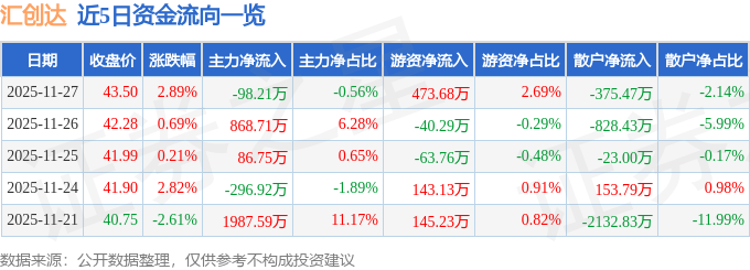 证券之星消息,截至2025年11月27日收盘,汇创达(300909)报收于43.5元,上涨2.89%,换手率3.3%,成交量4.05万手,成交额1.76亿元。