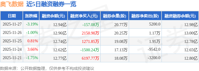 奥飞数据融资融券信息显示,融资方面,当日融资买入9277.42万元,融资偿还9434.5万元,融资净偿还157.08万元。融券方面,融券卖出7500.0股,融券偿还2300.0股,融券余量20.77万股,融券余额397.54万元。融资融券余额12.98亿元。