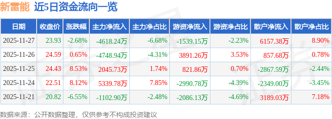 证券之星消息,截至2025年11月27日收盘,新雷能(300593)报收于23.93元,下跌2.68%,换手率6.3%,成交量28.38万手,成交额6.92亿元。