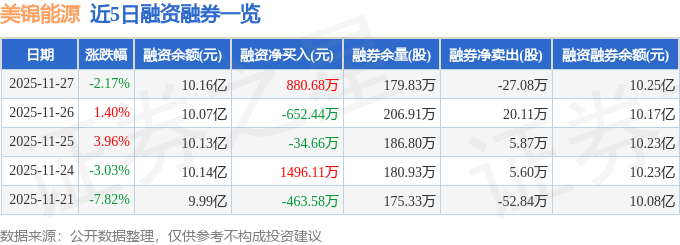 证券之星消息,截至2025年11月27日收盘,美锦能源(000723)报收于4.95元,下跌2.17%,换手率1.9%,成交量83.37万手,成交额4.16亿元。