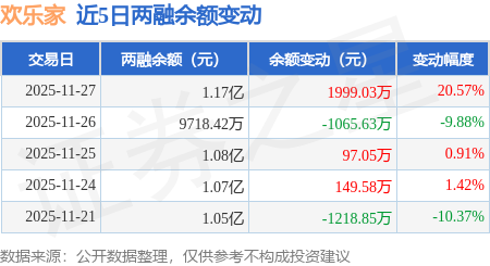 证券之星消息,11月27日,欢乐家(300997)融资买入8300.29万元,融资偿还6301.26万元,融资净买入1999.03万元,融资余额1.17亿元,近20个交易日中有11个交易日出现融资净买入。