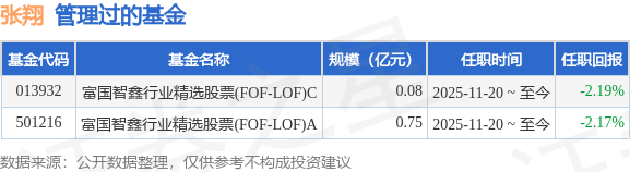 张翔先生:中国国籍,硕士,曾任方正证券股份有限公司研究员,东吴证券股份有限公司分析师,猫头鹰基金研究院投资经理,开源证券股份有限公司基金配置组长;自2025年10月加入富国基金管理有限公司。2025年11月20日任富国智鑫行业精选股票型基金中基金(FOF-LOF)基金经理。