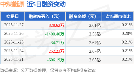 证券之星消息,11月27日,中煤能源(601898)融资买入3692.15万元,融资偿还2863.53万元,融资净买入828.62万元,融资余额2.61亿元。