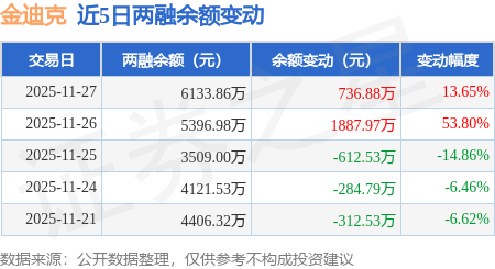 证券之星消息,11月27日,金迪克(688670)融资买入4071.08万元,融资偿还3334.2万元,融资净买入736.88万元,融资余额6133.86万元,近20个交易日中有12个交易日出现融资净买入。