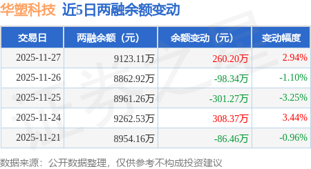 证券之星消息,11月27日,华塑科技(301157)融资买入1073.83万元,融资偿还813.63万元,融资净买入260.2万元,融资余额9123.11万元。