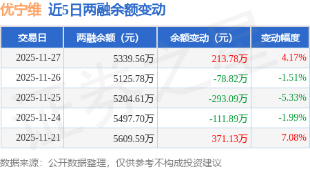 证券之星消息,11月27日,优宁维(301166)融资买入370.8万元,融资偿还157.02万元,融资净买入213.78万元,融资余额5339.56万元。