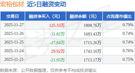 证券之星消息,11月27日,宏裕包材(920274)融资买入265.29万元,融资偿还139.96万元,融资净买入125.33万元,融资余额1808.76万元。