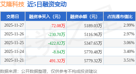 证券之星消息,11月27日,艾隆科技(688329)融资买入238.47万元,融资偿还166.39万元,融资净买入72.08万元,融资余额5189.03万元。