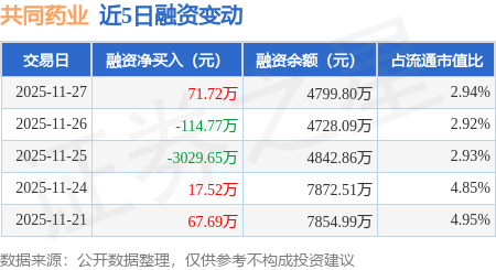 证券之星消息,11月27日,共同药业(300966)融资买入374.87万元,融资偿还303.15万元,融资净买入71.72万元,融资余额4799.8万元。