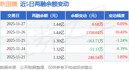 证券之星消息,11月27日,秋田微(300939)融资买入2488.45万元,融资偿还2481.77万元,融资净买入6.68万元,融资余额1.44亿元。