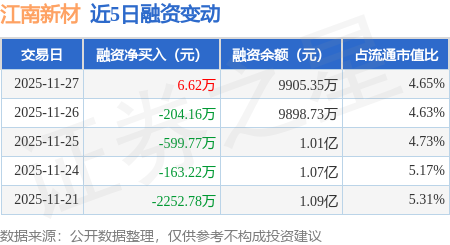 证券之星消息,11月27日,江南新材(603124)融资买入803.74万元,融资偿还797.12万元,融资净买入6.62万元,融资余额9905.35万元。