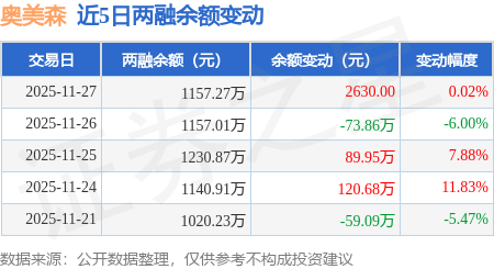 证券之星消息,11月27日,奥美森(920080)融资买入38.13万元,融资偿还37.86万元,融资净买入0.26万元,融资余额1157.27万元,近20个交易日中有11个交易日出现融资净买入。