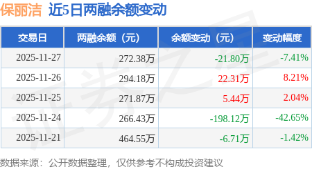 证券之星消息,11月27日,保丽洁(920802)融资买入30.38万元,融资偿还52.18万元,融资净卖出21.8万元,融资余额272.38万元,近20个交易日中有12个交易日出现融资净买入。
