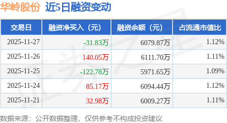 证券之星消息,11月27日,华岭股份(920139)融资买入149.13万元,融资偿还180.96万元,融资净卖出31.83万元,融资余额6079.87万元。