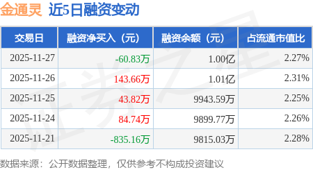 证券之星消息,11月27日,金通灵(300091)融资买入357.84万元,融资偿还418.67万元,融资净卖出60.83万元,融资余额1.0亿元。