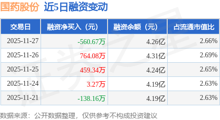 证券之星消息,11月27日,国药股份(600511)融资买入999.2万元,融资偿还1559.87万元,融资净卖出560.67万元,融资余额4.26亿元。