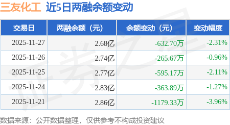 证券之星消息,11月27日,三友化工(600409)融资买入3392.3万元,融资偿还4025.12万元,融资净卖出632.82万元,融资余额2.66亿元。
