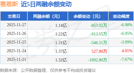 证券之星消息,11月27日,赛恩斯(688480)融资买入418.75万元,融资偿还1272.67万元,融资净卖出853.92万元,融资余额1.14亿元,近20个交易日中有11个交易日出现融资净买入。